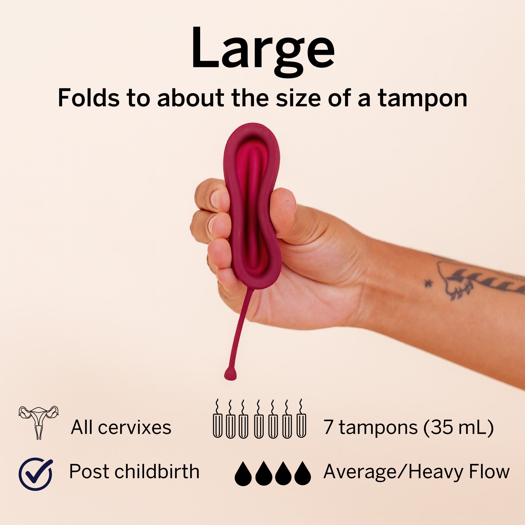 - Pixie Disc Large: Holds 35ml of fluid or the equivalent of 7 tampons.