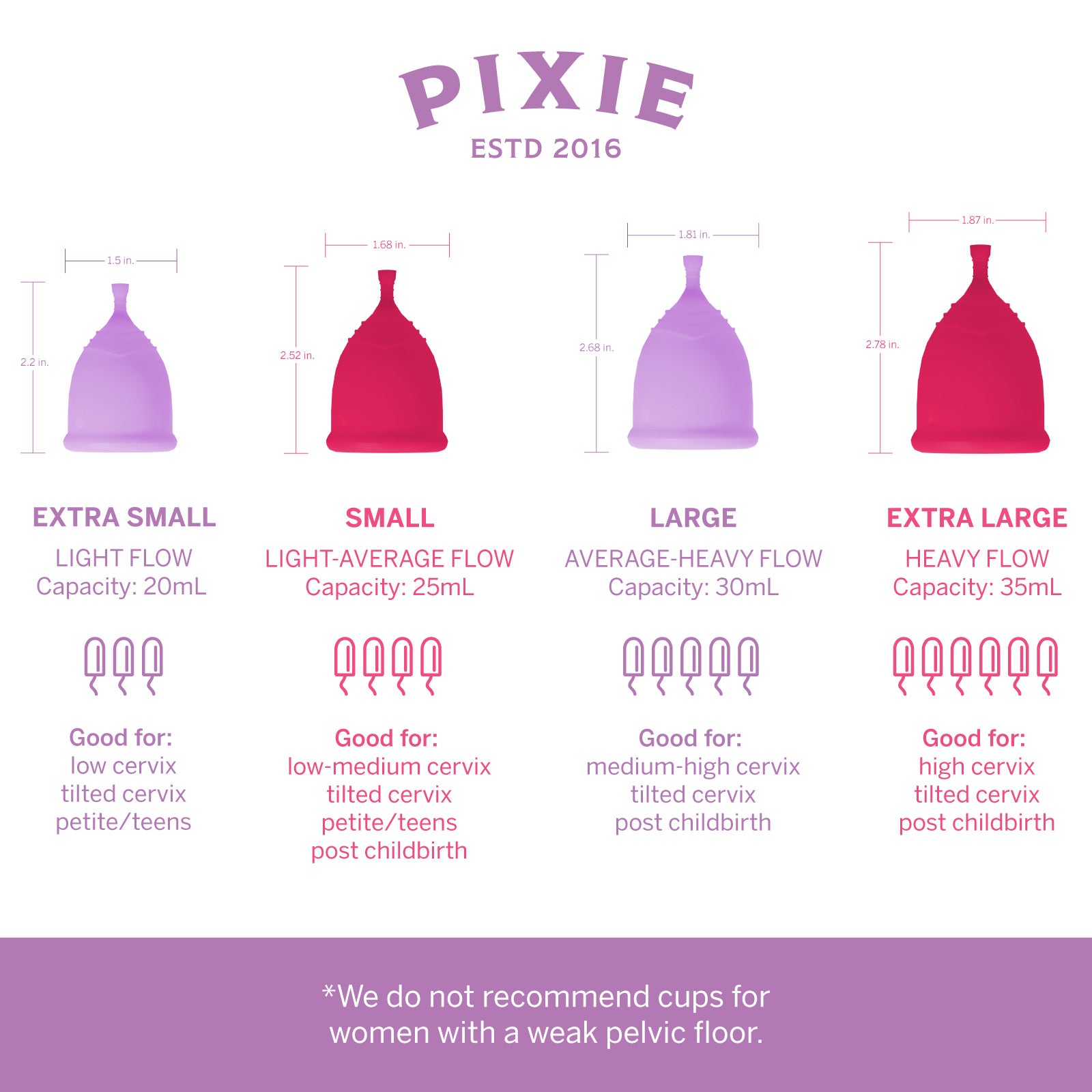 If your first Pixie Cup isn’t the right size, we will send you a new style or size at no extra cost or offer a full refund. This takes the stress out of finding your perfect fit. With 6 different sizes and 2 styles (Slim and Regular), we have a Pixie Cup that will fit any physique or reproductive story.
