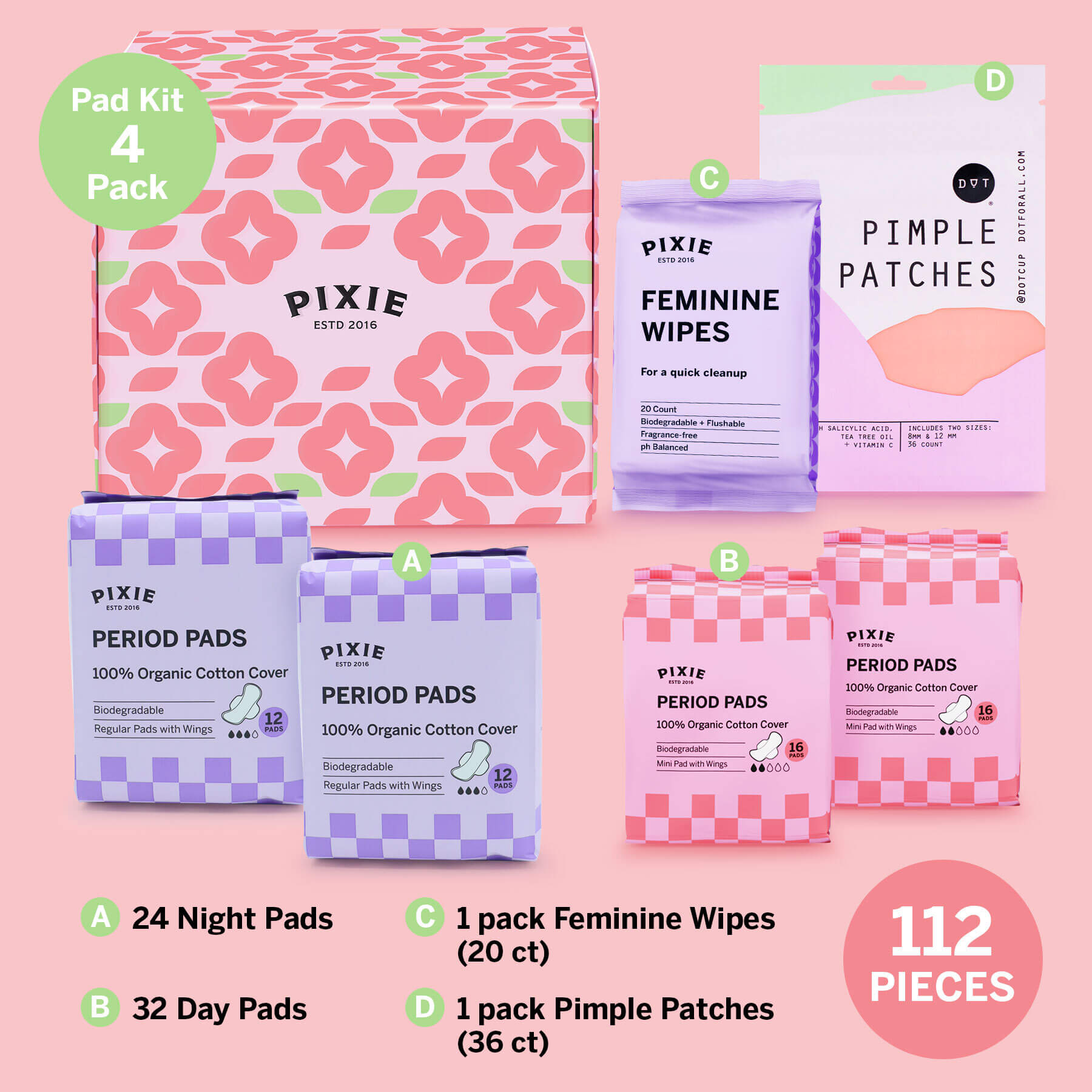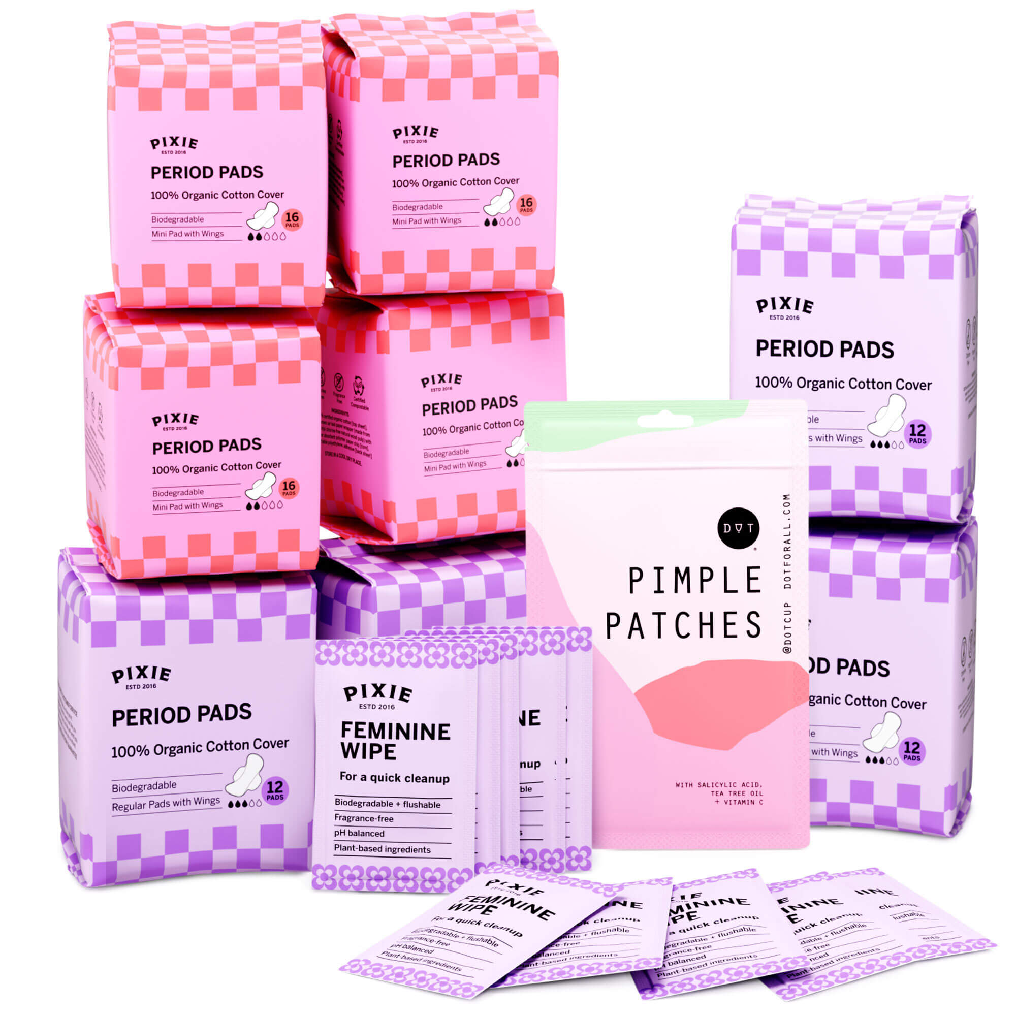 FEMININE ESSENTIALS. This kit includes Pixie’s 100% Certified Organic Cotton covered Mini Pads and Regular Pads. PLUS, Pixie’s fan favorite Feminine Wipes and Dot Pimple Patches.